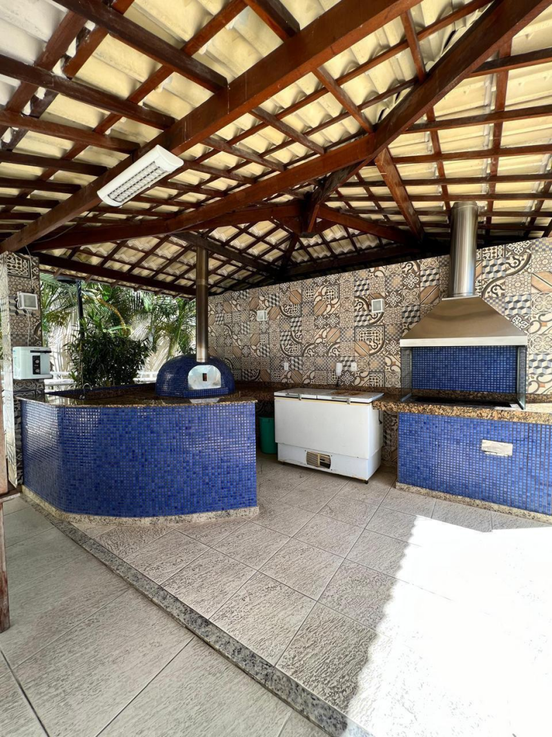 quiosque com churrasqueira e quadra poliesportiva.