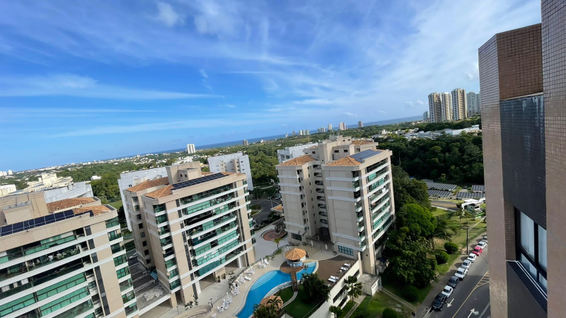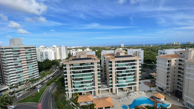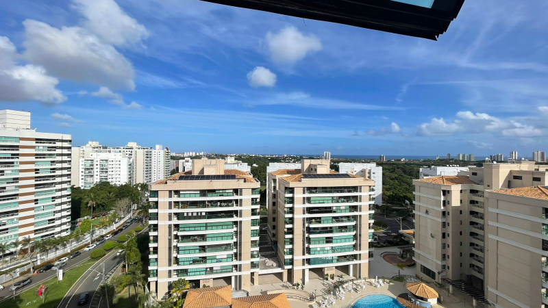 APTO. DE COBERTURA NO PALM VILLE, NASCENTE TOTAL DISPONÍVEL PARA VENDA – Imóvel finamente decorado e mobiliado,226m², 03 quartos sendo 01 suíte, sala de estar e jantar com vista panorâmica, piscina privativa e espaço gourmet com churrasqueira, 03 vagas de garagem, sendo 02 soltas. O Palm Ville está localizado em AlphaVille1, Salvador, com 2 torres de 14 andares. Infraestrutura de lazer e segurança: segurança 24 horas e leitor biométrico para acesso dos moradores.