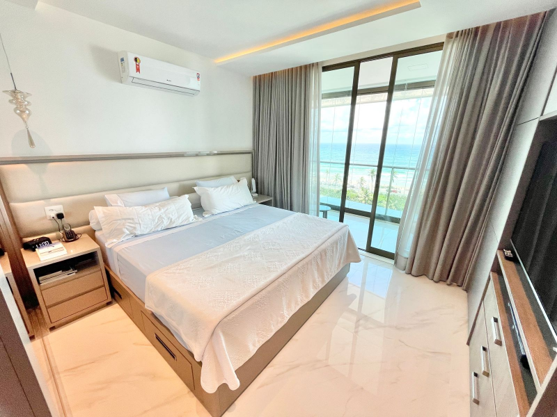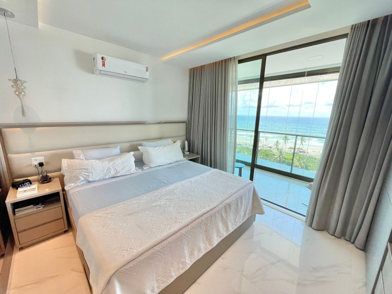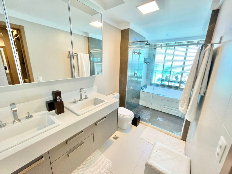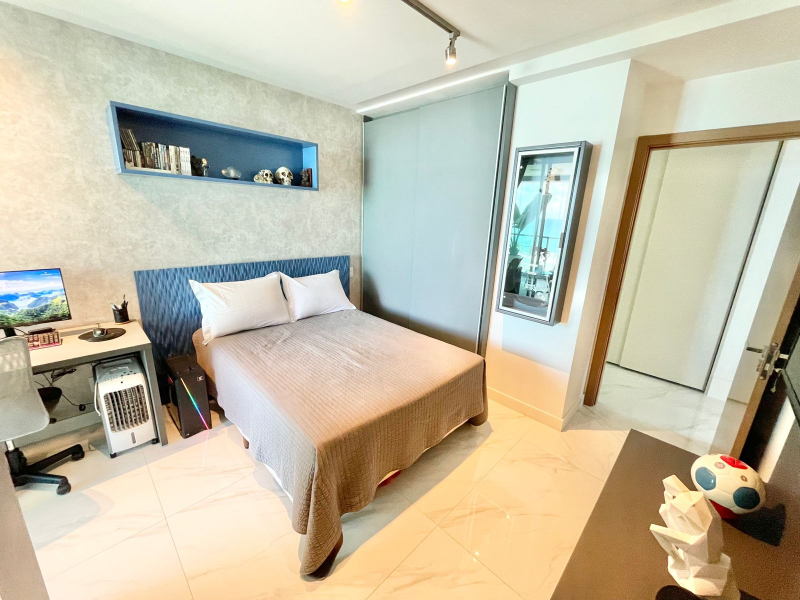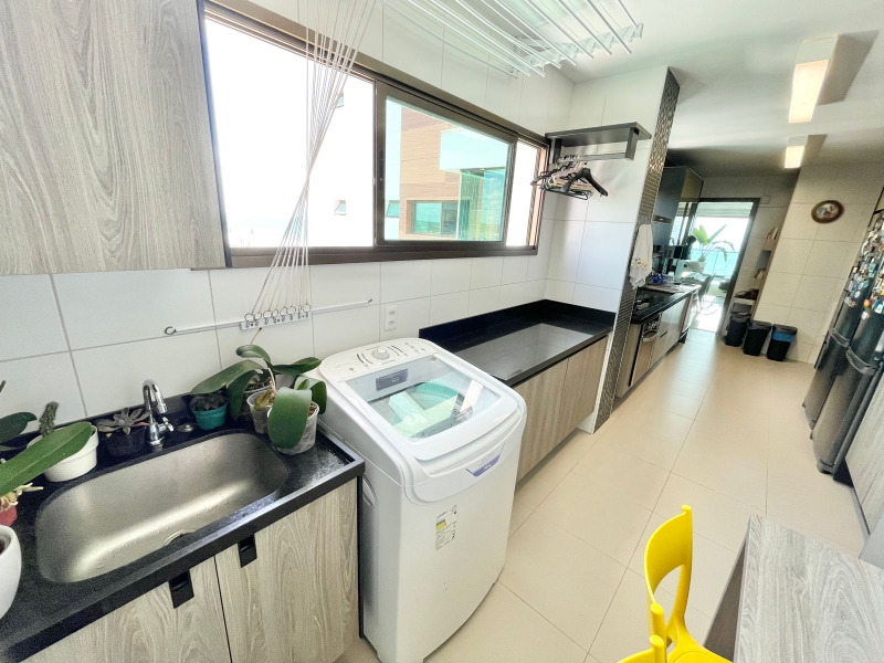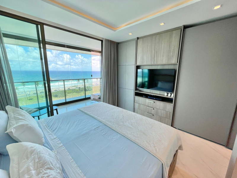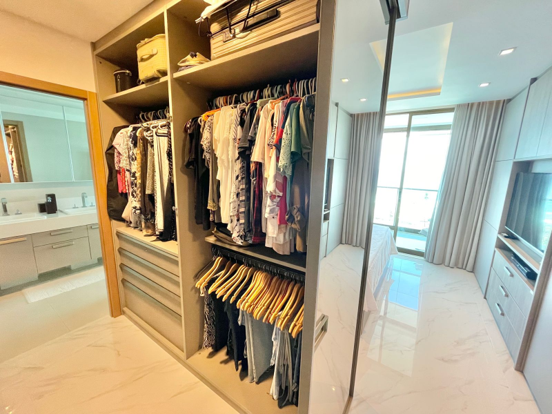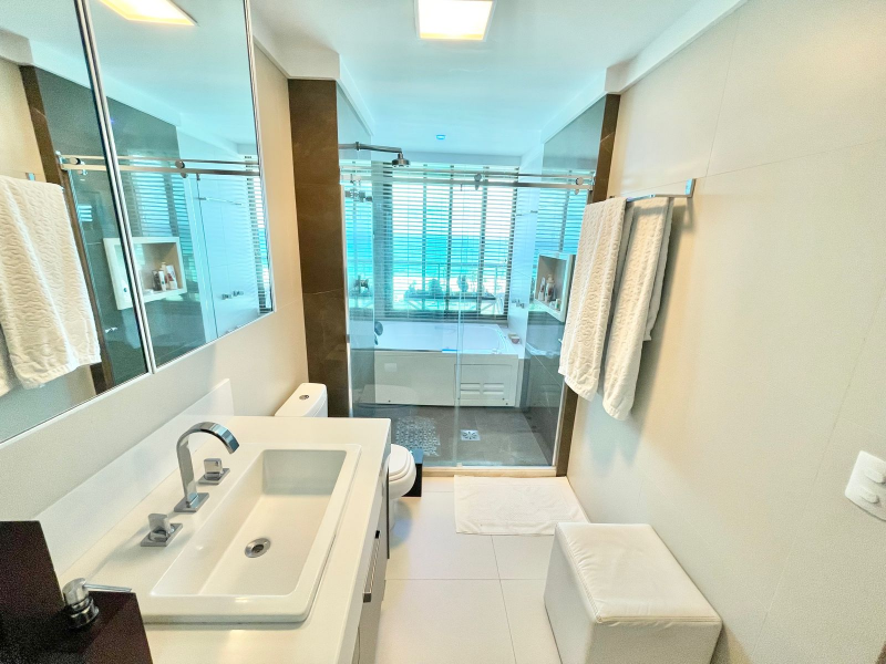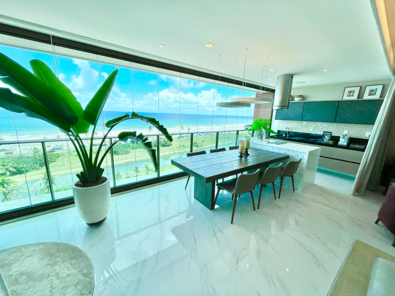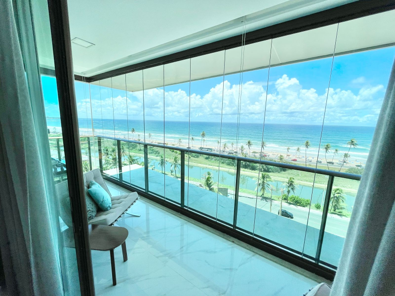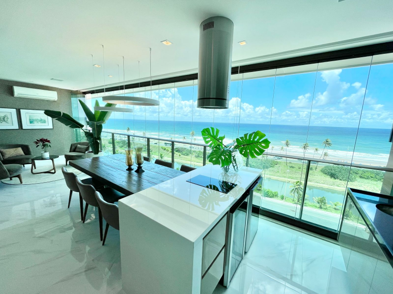 São 4 suítes com Vista mar deslumbrante, Varandão gourmet com fechamento em reike, piso em porcelanato, acabamento de alto padrão. Sala de Jantar com Adega e Louçaria, Lavabo, Varanda menor transformada em gabinete, rouparia, suíte master com closet, varandão vista mar e banheira de