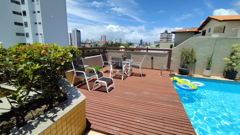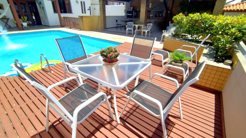 Área Externa: Piscina com cascata e deck em madeira, área Gourmet com churrasqueira e espaço de convivência, Jardins.