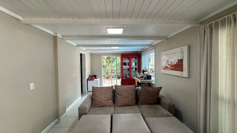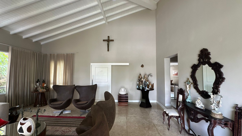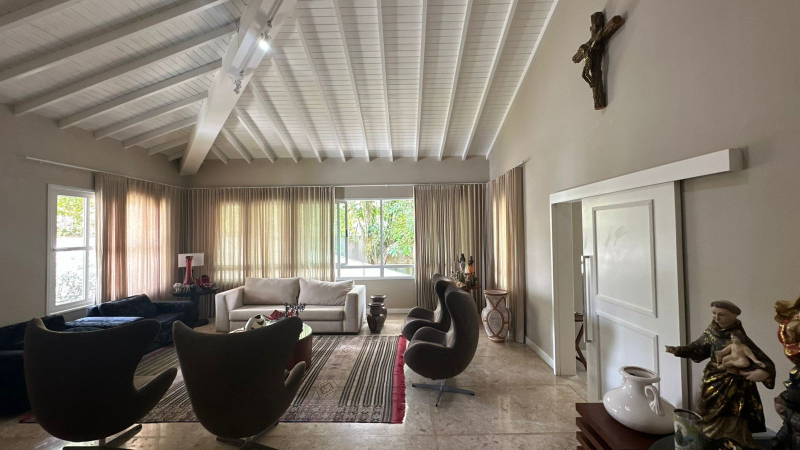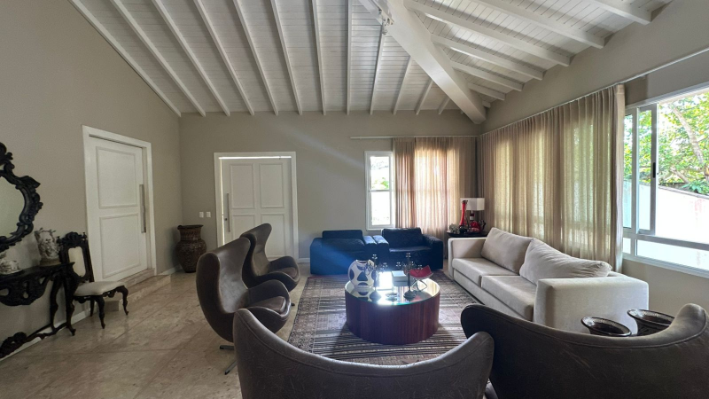 * Sala ampla com pé direito alto e teto madeirado pintado